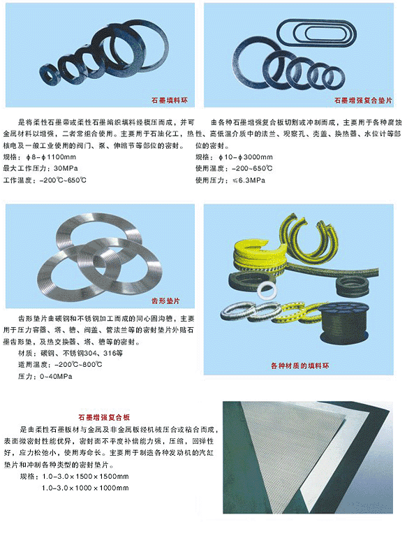 公司主要经营密封垫片制品,包含:金属缠绕式垫片,编织盘根填料,密封板材,碳-石墨浸金属制品,化学药剂,耐火保温材料